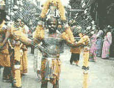 trance to the rhythm of drums, devotees of Muruga carry the Kavadi all the way up the