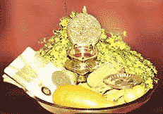 fresh linen, golden cucumber, betel leaves, arecanut, metal mirror, the yellow