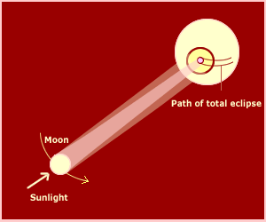 | A lunar eclipse occurs when the moon lies opposite to the sun with the intervening between the two. The shadow of the earth falls on the moon. This happens on the full moon day when the sun-moon-earth trio falls on the same line.Again, because of the obliquity of the moon's path to the ecliptic,this situaution does not arise every full moon day. | ||||||||||||||||||||||||||||